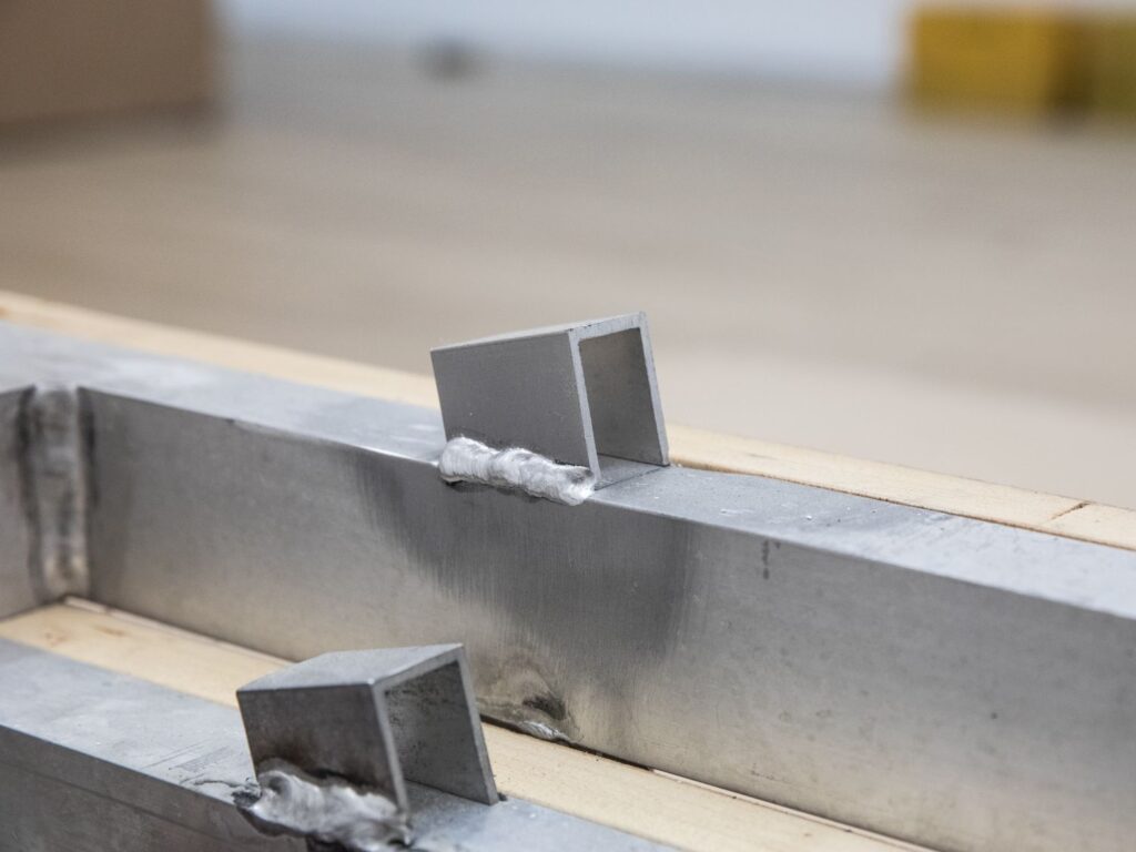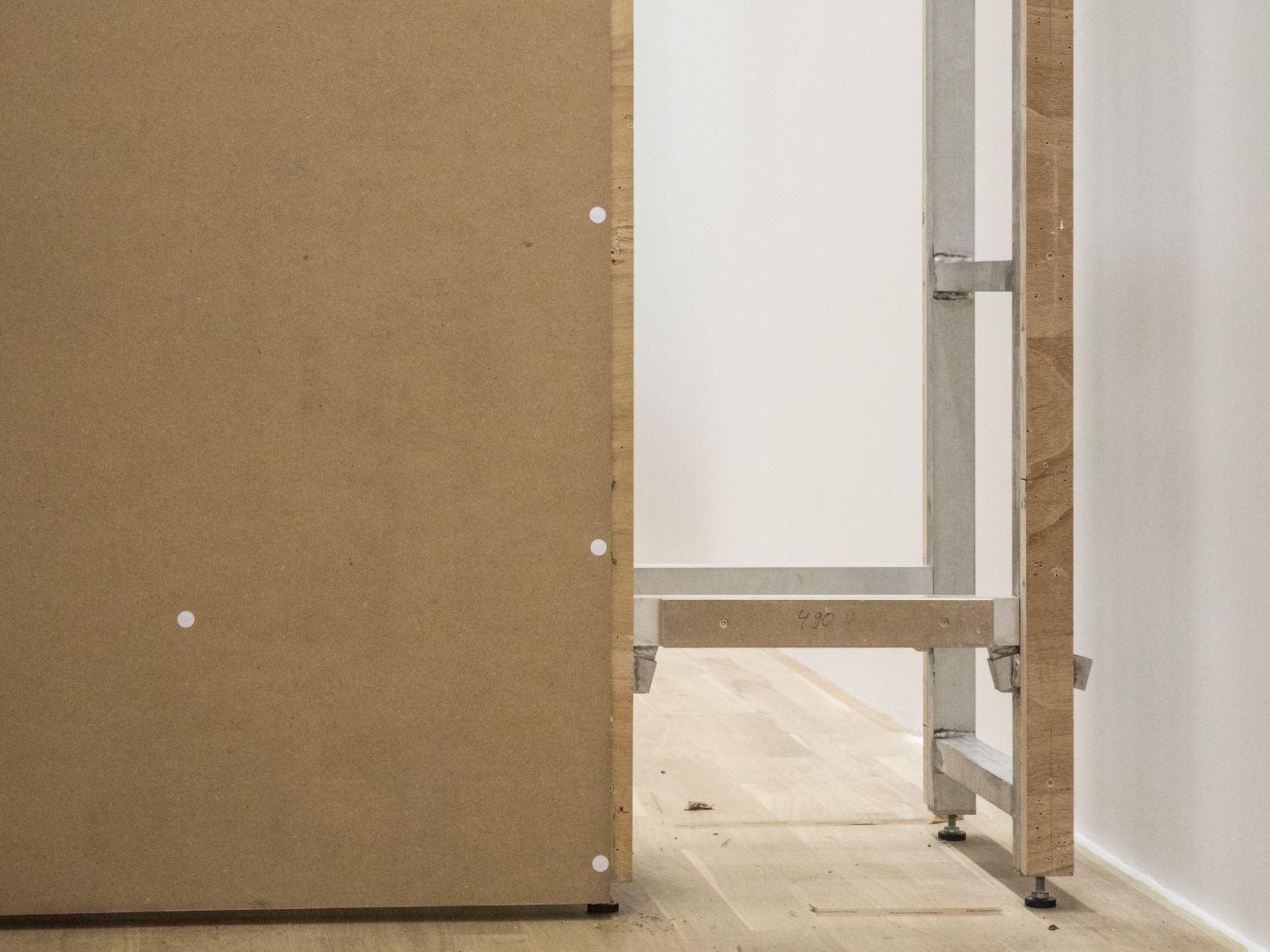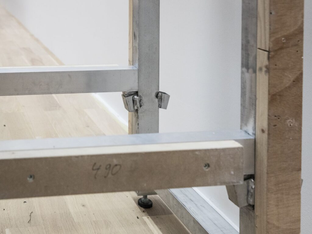 The interior construction is planked on all sides with a facing layer (we recommend a 13 mm blockboard with MDF face veneer). The blockboards are screwed onto the planed wooden strips, which are attached to all outer sides of the aluminium construction.
